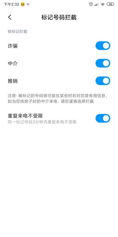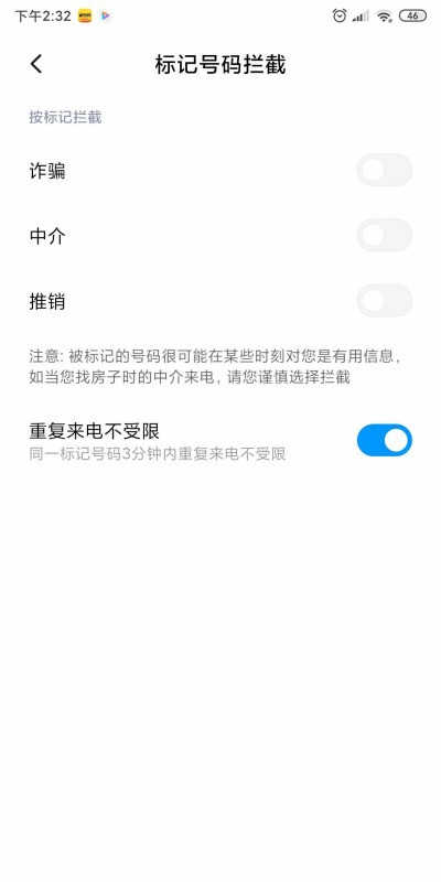 小米通話設置中有“騷擾攔截”選擇來電并設置中的來電攔截中的攔截標識號碼來電
