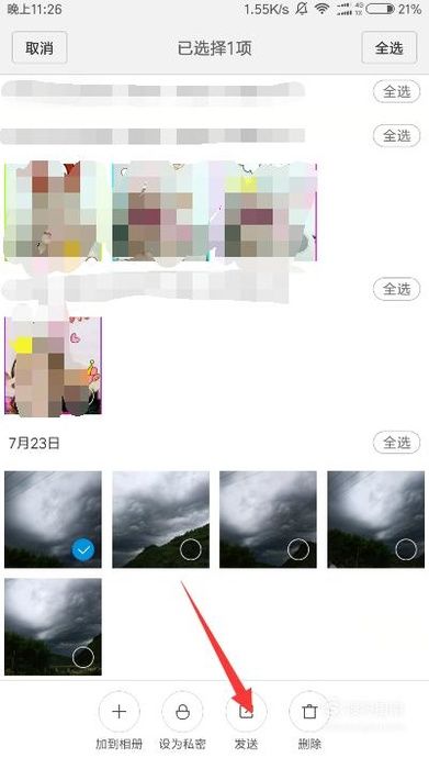 3.長按一張我們要上傳的圖片,然后勾選我們要上傳的所有照片。點擊最下方的發送按鈕。
