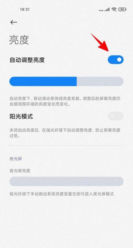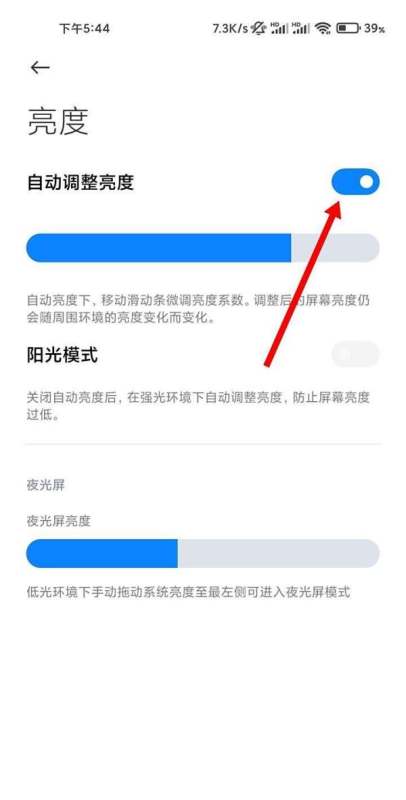 開啟自動調整亮度在亮度設置界面中找到“自動調整亮度”開關,點擊使其變為藍色狀態,即表示功能已成功開啟。