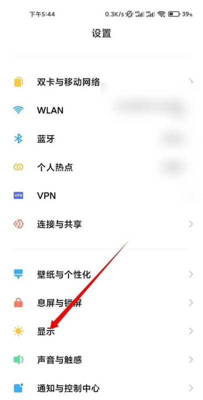 進入顯示設置在設置列表中滑動查找并點擊“顯示”選項,進入顯示相關功能配置頁面。