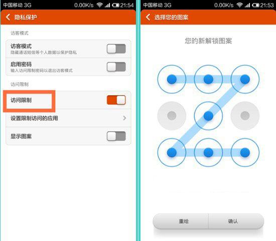 7、圖案密碼輸入之后,就會(huì)彈出一個(gè)界面,里面全是小米手機(jī)3上安裝的所有程序應(yīng)用,每個(gè)程序后面都有一個(gè)開關(guān),開啟這個(gè)開關(guān),系統(tǒng)就會(huì)自動(dòng)將這個(gè)程序給加密上鎖了。
