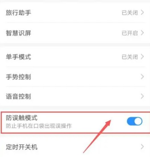4、最后再把【防誤觸模式】后面的開關打開,防止手機在口袋出現誤操作如下圖所示: