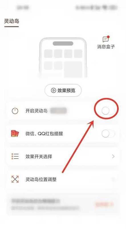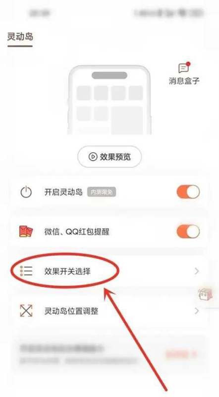 選擇并啟用效果點擊“效果開關選擇”選項,進入效果列表后,將右側對應效果的開關滑動至開啟狀態,即可應用靈動島樣式。