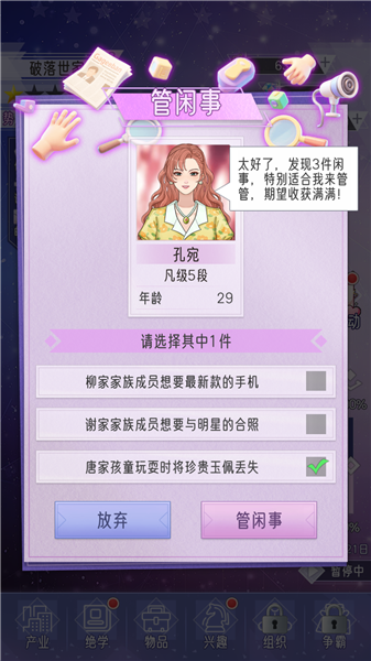 商業投資、人才培養、輿論應對等機制環環相扣,玩家需要平衡收益與風險,讓家族在穩健與冒險間找到最佳路線。